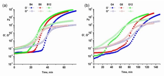 The rheological profiles of two series of crosslinking systems obtained for hydrogels with neat cyclodextrins and CDLA are presented in Figure 4. The kinetic measurements allowed us to determine the gelation time, the moment at which gelation of the reaction system begins—defined as the crossover point of the viscoelastic moduli, storage modulus (G’) and loss modulus (G”), respectively. The evolution of the G’ and G’’ parameters begins in a typical liquid state (G” > G’) for the hydrogels crosslinked with CD. Further, after specific periods of time, the reaction mixture undergoes gelation processes signaled by the steep increase in G’, accompanied by a moderate increase in G”. The crossover point observed during the G’ and G” evolution is consistent with the gelation point (G’ = G”) and represents the onset of the crosslinking reaction [] which is correlated with a transition process from a viscous to a solid-like behavior, specific to the tested frequency. A clear variation of the characteristic gelation time with the content of reacting species in the initial feed may be observed (Table 2 and Figure 4). Thus, the gelation time (Tx, where x nominates the hydrogel sample) increases with the amount of CD, as follows: TB12 < TB8 < TB4. This behavior may be explained by the fact that, for mixtures with a lower content of OH groups, a shorter period of time is needed for oligosaccharide incorporation within the three-dimensional network and also for the gelation of the respective formulation via polyaddition reactions. Similar behavior was observed for the reaction systems containing CDLA (G series), as gelation proceeds faster when there is a lower content of CDLA in the reaction feed (TG12 < TG8 < TG4). Therefore, no matter the type of CD crosslinker, an excess of isocyanates leads to faster OH consumption and, consequently, to a faster polyaddition process.
