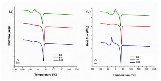 Generally, after the glass transition temperature the samples present an exothermic peak, associated with the crystallization of the amorphous domains, and an endothermic peak that corresponds to the melting of the crystalline domains. This is characteristic for both the B and G series. As the PEG/CD molar ratio increases from 4 to 8, the mobility of the network increases. The samples B8 and G8 crystallize during cooling and they do not present any crystallization in the heating step. This aspect is also sustained by the smaller values of ΔCp of B8 and G8 as compared to the B4 and G4, which indicates the presence of crystalline domains at the beginning of the second heating. The amorphous regions are constrained to a higher degree by the crystalline domains for the samples B8 and G8. However, as more PEG is included in the networks (B12 and G12), the mobility of the networks and the ability of crystallization during cooling is again reduced. This effect is more evident for the G series.