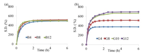 The amount of CD does not greatly influence the degree of swelling for the B series (Figure 7a), as there are relatively small differences in the water uptake, no matter the CD content. The observed results are consistent with those previously published in the work of Cesteros et al. [].