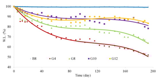The introduction of the oligolactide sequence in the crosslinked networks provides them with their hydrolytic degradation capacity. The weight loss following the hydrolytic degradation of the CDLA-PEG hydrogels is presented in Figure 8 together with the weight loss measured for one CD-PEG hydrogel, used as non-degradable reference in the present degradation conditions (PBS buffer at pH = 7.4 and 37.5 °C). The reference sample did not suffer any significant weight loss while the G series experienced weight losses according to the oligolactide content in each sample. Therefore, the degradation pathway of the prepared hydrogels is mediated solely through the hydrolysis of the ester bonds, as expected. The highest weight loss may be noted in the case of the G4 hydrogel, of about 48% after 193 days. Samples with a lower oligolactide content (G10, G12) reached only an approximately 20% weight loss.