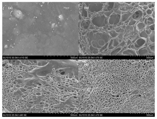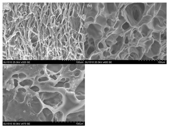 In principle, the degradation of PLA-PEG networks does not only depend on the cleavage of the ester bonds but, also, on the physical structure of the polymer network [], and more specifically on the possible phase separations that may occur during the crosslinking process. Although the initial SEM inspection of the hydrogels did not reveal structural defects related to different network packing or phase separations, further investigation of the degradation process may illuminate structural differences. The degradation process may be correlated with the homogeneity of the chemical connectivity, in the studied polymer networks, by inspecting the microstructure of the degraded samples.