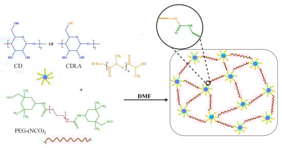 The current study takes into consideration the preparation of cyclodextrin-based polyurethane hydrogels with controlled biodegradable behavior and three types of building blocks expected to grant the obtained network specific properties. Thus, the polylactide (PLA) sequence provides hydrolytic degradability [,] and as a spacer influences the network architecture [], while the polyethylene glycol (PEG) chains ensure the hydrophilicity and flexibility of the network [], and the CDs act as network crosslinking moieties and imparts host–guest inclusion abilities [,,]. The use of these three elements together may lead to the development of advanced materials comprising all the above mentioned properties. Combinations of PLA with PEG and CD have already been prepared through radical polymerization crosslinking [] and herein, we investigate the possibility of preparing tri-component networks through the polyaddition reaction of alcohol groups to isocyanates.