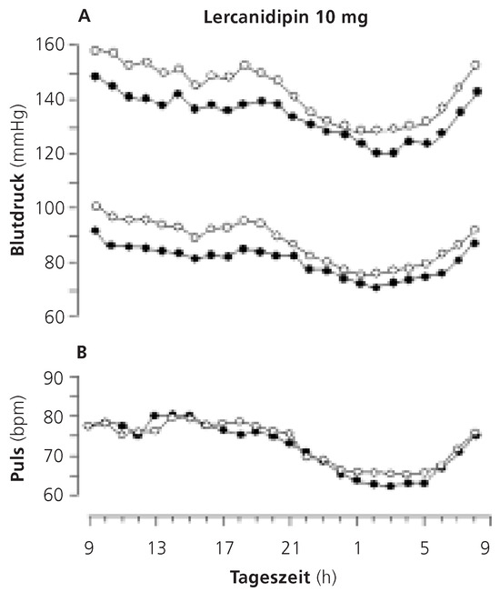 Durchschnittlicher systolischer und diastolischer Blutdruck (A) und Puls (B) während 24 Stunden vor (offene Kreise) und nach vierwöchiger Behandlung mit Lercanidipin 10 mg (volle Kreise) (modifiziert nach [16]).