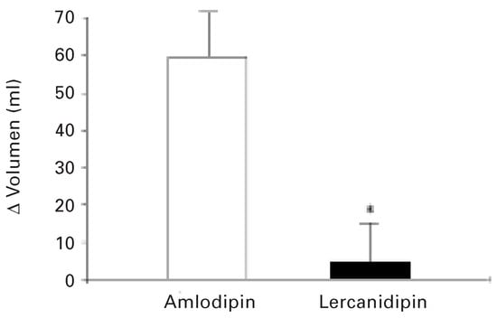 Zunahme des Unterschenkelvolumens (Durchschnittswert ± SD) nach 8 Wochen Behandlung mit Lercanidipin 10/20 mg oder Amlodipin 5/10 mg gegenüber vor der Behandlung, gemessen mit der objektiven Methode der WasserverdrängungsVolumenmetrie (water displacement volumetry) bei 92 Frauen nach der Menopause. * p <0,001 Lercanidipin vs. Amlodipin (modifiziert nach [72]).