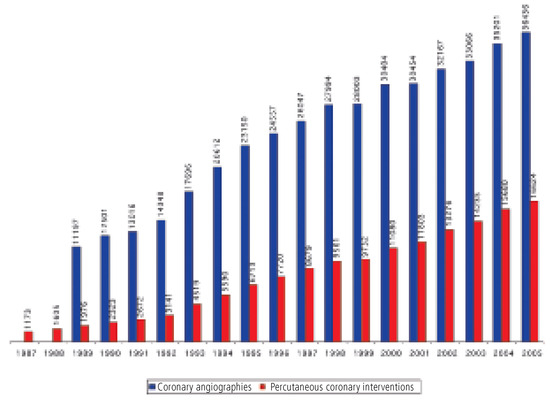 Background: Since 1987, a nationwide annual survey of percutaneous cardiac interventions is performed in Switzerland, which allows recognition of contemporary trends and comparison with other countries. Methods: Based on a standardised questionnaire, all adult percutaneous cardiac intervention centres in Switzerland were asked to report on the volume and the circumstances of their activities in 2005. The response rate was 100%. Data were compared with those from previous years. Results: In 2005, 36 436 coronary angiographies (CA) (2004: 35 201; + 3.5%) and 16 624 percutaneous coronary interventions (PCI) (2004: 15 680; + 6%) were carried out in 5 university hospitals, 9 public, non-university hospitals, and 13 private hospitals by 205 operators (80 of them performing only diagnostic studies). Ninety-three percent of PCI were performed ad hoc, and 78% were single-vessel interventions. Stents were placed in 91% of PCI (2004: 91%). Drug-eluting stents (DES) were used in 78% of procedures (2004: 66%). Emergency procedures (primary PCI or rescue PCI after failed thrombolysis) accounted for 19% of interventions. Glycoprotein IIb/IIIa inhibitors were used in 23% of PCI (2004: 23%). Myocardial infarction after PCI was reported in 1.1% of PCI, emergency coronary artery bypass grafting was needed in 0.1% of cases, and in-hospital mortality after PCI was 0.5%. In addition, 52 mitral, 11 aortic, and 16 pulmonary balloon valvuloplasties, and 510 interventions for closure of patent foramen ovale (2004: 438) as well as 94 interventions for closure of atrial septal defect (2004: 92) were performed. Conclusions: The number of CA and PCI and especially the utilisation of DES are steadily increasing in Switzerland. The number of interventions for closure of patent foramen ovale and atrial septal defect is still growing, most probably due to a more aggressive diagnostic work-up and treatment of patients with stroke. Full article