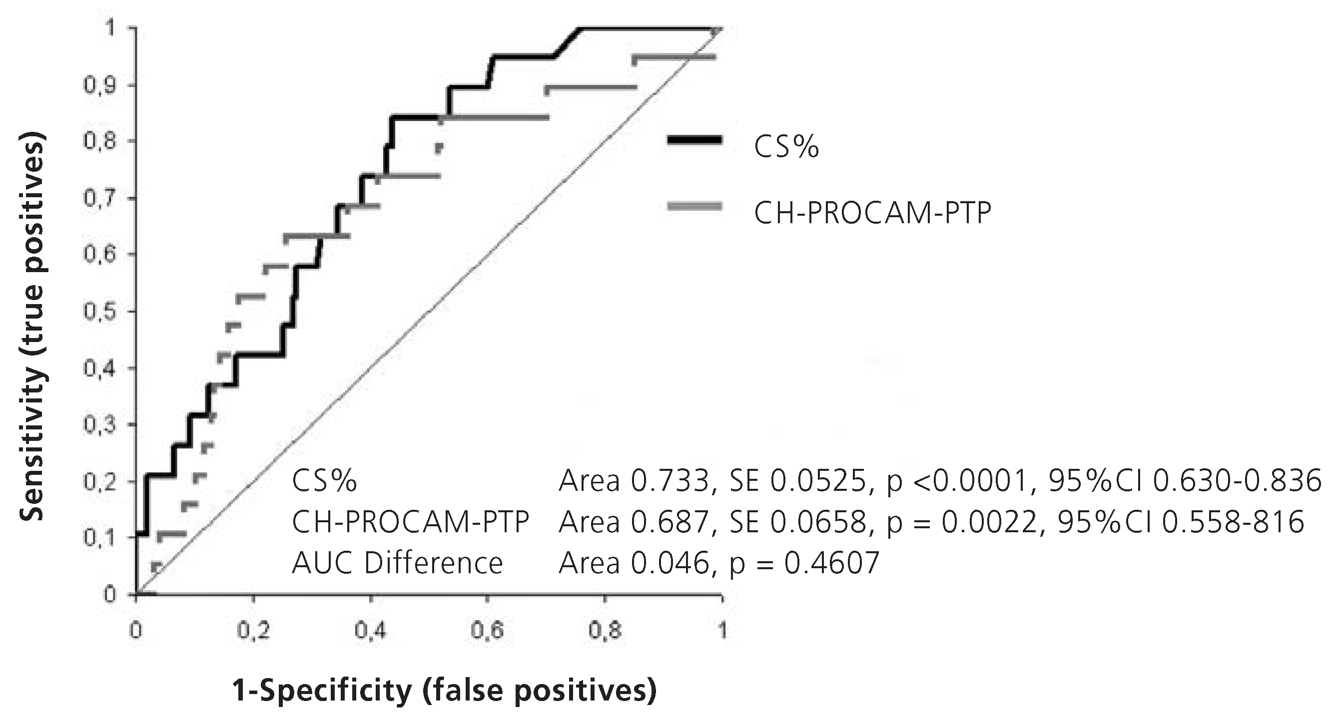 The sensitivity and specificity of the EU-SCORE-PTP algorithm to detect high-risk patients defined by the CH-PROCAM-PTP extension were only 70% and 69%, respectively (