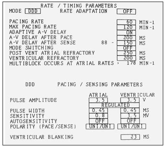 Einer 80jährigen Patientin wurde wegen eines intermittierenden, symptomatischen AVBlocks 3. Grades sowie Sinusstillständen ein DDDR-Schrittmacher (Marathon™, Intermedics Inc., Angleton, Texas USA) implantiert. Nach der Implantation vermutete man aufgrund der telemetrischen Überwachung eine Schrittmacher-Dysfunktion: der EKG-Streifen zeigt eine vollständige Dissoziation von Vorhof und Ventrikel mit einem zweiten Pacemaker-Spike am Ende des QRS-Komplexes (Figure 1). Die derzeitige Schrittmacher-Programmierung kann Figure 2 entnommen werden. Mit dieser Information sollte die korrekte Diagnose gestellt werden können: Vorhofelektroden-Dislokation? Crosstalk? Anderes?