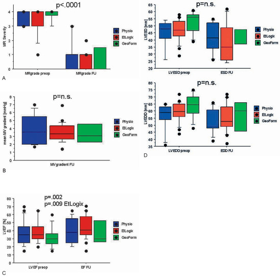 Effect of annuloplasty in IMR. (A) IMR is successfully eliminated with all three types of rings (Physio: Conventional semi-rigid annuloplasty ring used for restrictive annuloplasty in IMR). (B) Low transmitral mean gradients during follow-up were measured in all groups. (C) Improvement in LVEF was significant overall and especially with the use of the EtLogix ring. (D) Although not significantly, LV dimensions decreased both end-systolic (above) and end-diastolic (below) in all three groups during follow-up.