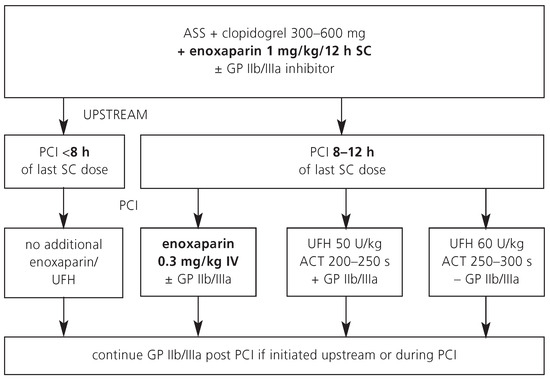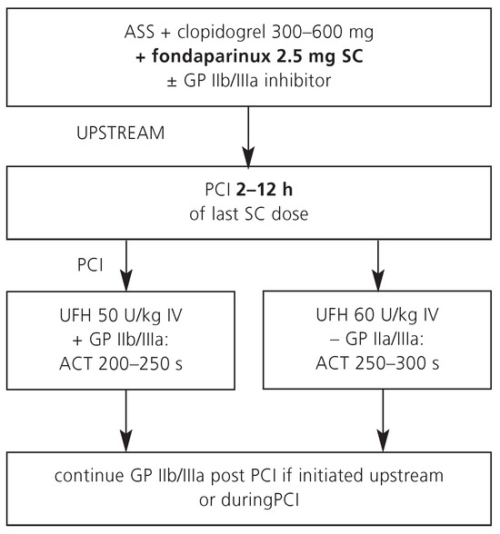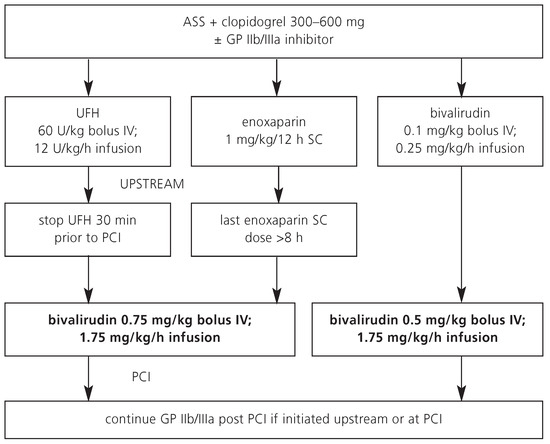 In Switzerland, UFH is still the most commonly used antithrombotic agent during PCI. Advantages and disadvantages of UFH are listed in Table 1. A typical dose regimen for patients who are referred for an early invasive strategy is shown in Figure 1.