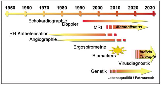 Auswahl an diagnostischen Möglichkeiten, die bei Herzinsuffizienz wichtig sind, in der Vergangenheit, der Gegenwart und der Zukunft. Zeitachse semiquantitativ.