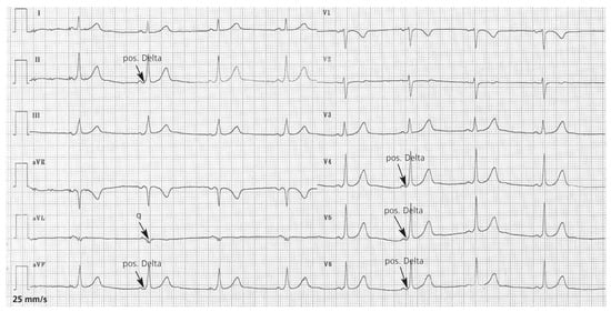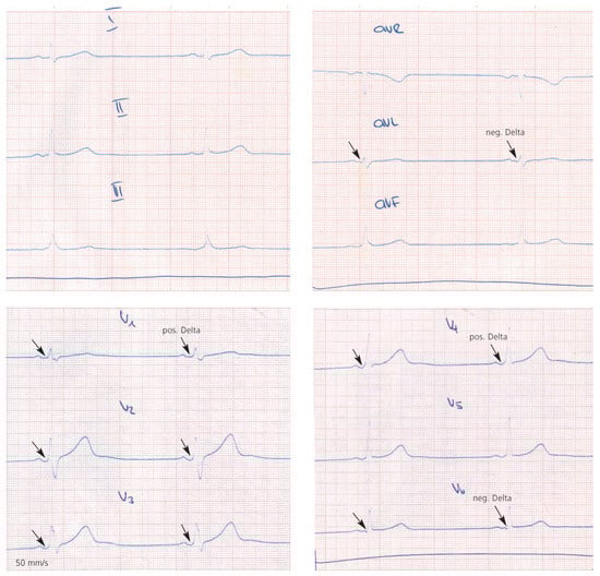 Das 12-Kanal-EKG nach Elektrokonversion zeigt einen normokarden Sinusrhythmus und eine verkürzte PQ-Zeit (100 ms) mit positiver Delta-Welle in II, III, aVF, V2–V6, isoelektrischem Delta in V1 und q in aVL.