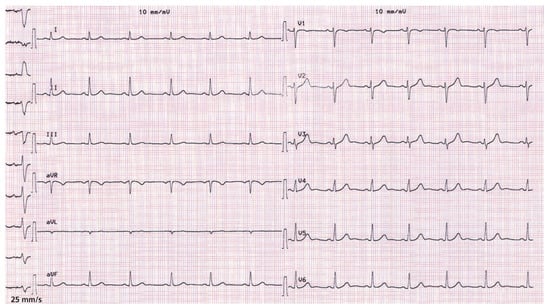 Das 12-Kanal-EKG nach Radiofrequenz-Katheterablation zeigt einen normofrequenten Sinusrhythmus. Die Delta-Wellen sind verschwunden.