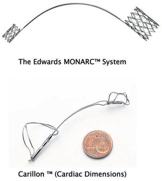 MitraClip® (Evalve, Inc., Menlo Park, CA, USA) which is used to realise a percutaneous edge-to-edge mitral repair, resulting in a double-orifice mitral valve. The first prospective registry results in over 100 patients are encouraging. EVEREST II is currently randomising patients to either percutaneous approach or standard surgical repair with clinical and echographic safety and efficacy endpoints. Devices dedicated to coronary sinus annuloplasty such as