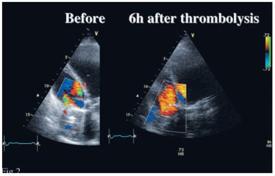 End-diastolic apical four chamber view of the right ventricle centered on the prosthetic tricuspid valve. Before thrombolysis, two small high velocity jets are visible on the lateral aspects of the valve. After thrombolysis, a normal pattern of low velocity jet through the entire valve is demonstrated.