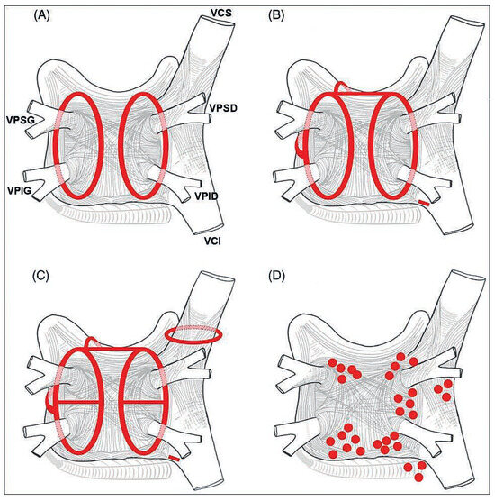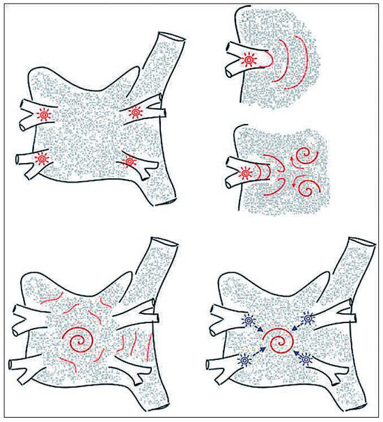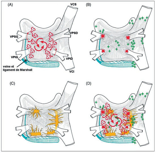 The pathophysiology of atrial fibrillation is complex, and appears to result from the interaction between initiating triggers, often in the form of rapidly firing ectopic foci located in the pulmonary veins, and an abnormal atrial tissue substrate capable of maintaining the arrhythmia through [...] Read more.