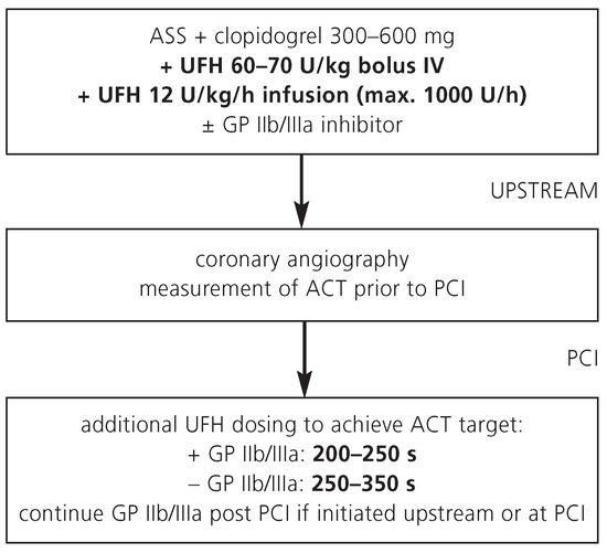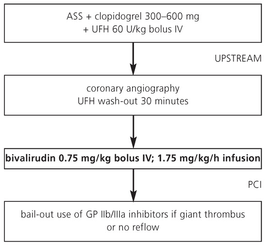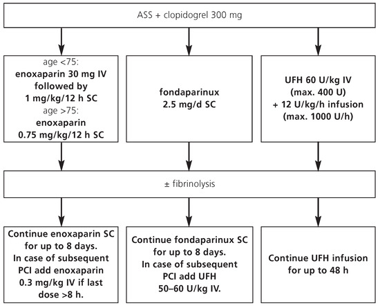 Appropriate antithrombotic therapy in patients with ST-elevation myocardial infarction (STEMI) helps reducing major cardiovascular events and bleeding complications. The majority of patients presenting with STEMI in Switzerland are referred for early reperfusion therapy. Primary percutaneous coronary intervention (PCI) has become the preferred reperfusion strategy and replaced the use of fibrinolysis in many hospitals. Optimal antithrombotic treatment is particularly important during mechanical intervention at the thrombotic coronary occlusion site due to activation of platelets and the clotting cascade. The combination of aspirin, clopidogrel, and glycoprotein IIb/IIIa inhibitors is recommended for STEMI patients undergoing primary PCI. Unfractionated heparin has been used for many years as antithrombin of choice in these patients; it is usually started at the time of presentation and is continued during PCI. The direct thrombin inhibitor bilvalirudin has emerged as promising antithrombotic agent for primary PCI, and a bivalirudin alone strategy without GP IIb/IIIa inhibitor may be especially useful for elderly patients or those with increased risk of bleeding. Antithrombotic treatment regimens for STEMI patients managed conservatively or with fibrinolysis differ from those undergoing primary PCI. Extended-duration therapy with either enoxaparin or fondaparinux for up to 8 days has emerged as antithrombotic regimen of choice for patients not undergoing primary PCI. This article intends to serve as a practical guide to interventional cardiologists and other interested physicians managing patients with STEMI. Current options of anticoagulant drug regimens are summarized from a practical point of view, with special attention to the primary management strategy. Full article
