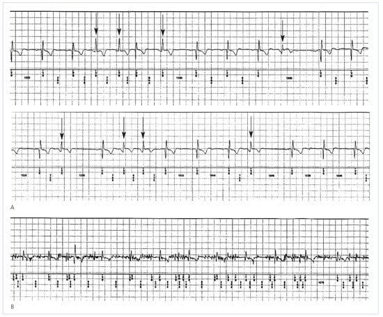 Inappropriate detection of AF. Shown in (A) an example of inappropriate detection of AF triggered by irregularities of R-R intervals due to frequent ventricular premature beats (arrows). (B) shows another example of inappropriate detection of AF due to high-frequency muscle noise detection. The patient was exercising at that time wearing a backpack.