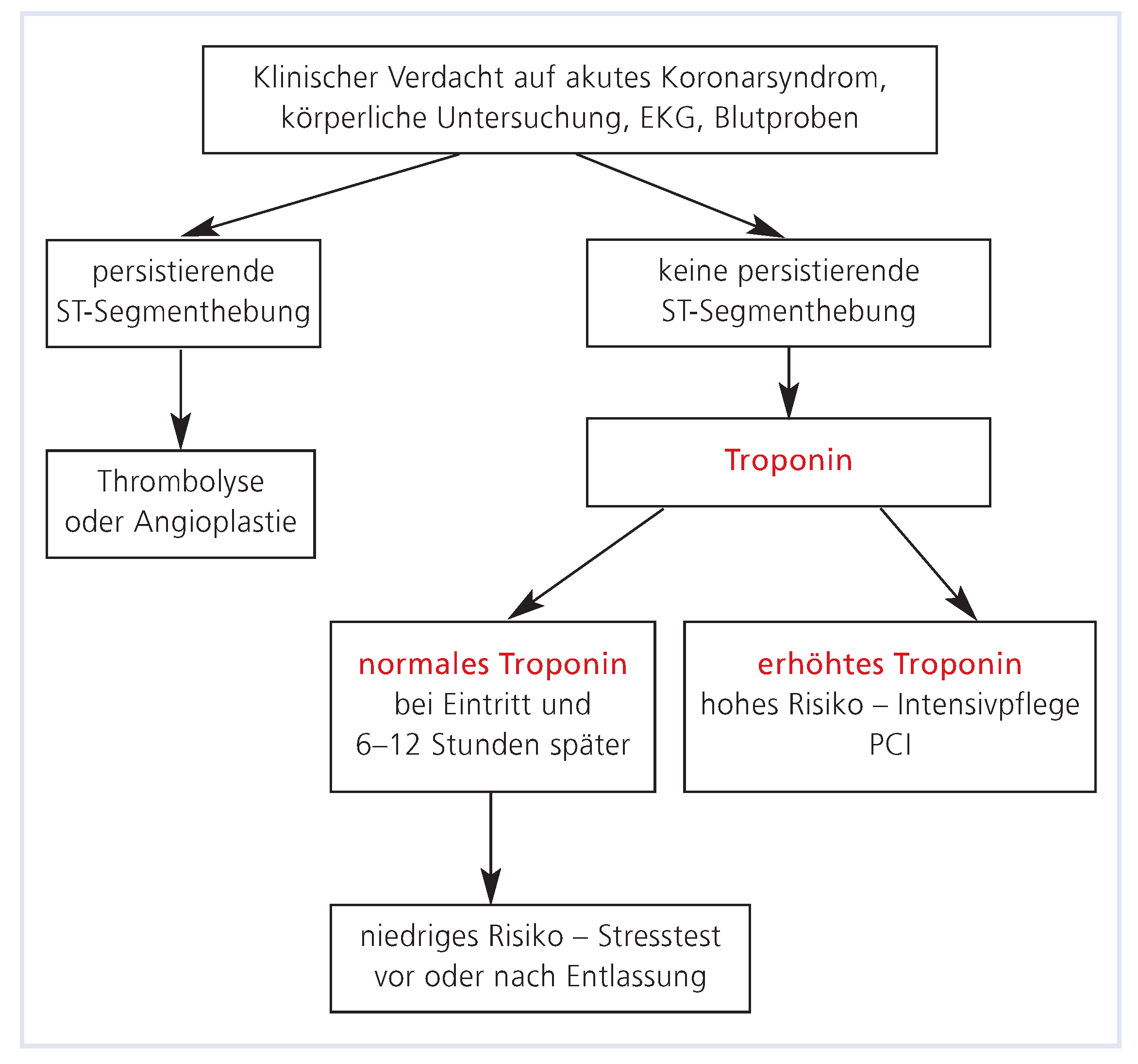 9] und dass eine Troponin-Bestimmung bei Aufnahme und eine zweite Bestimmung 6–12 Stunden später eine überlegene Methode zur Risikostratifizierung beim akuten Koronarsyndrom darstellt [