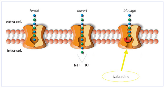 Figure 2. Le courant If est un déterminant majeur de la pente de dépolarisation diastolique qui contrôle la fréquence des potentiels d’action et, de ce fait, la fréquence cardiaque. L’inhibition sélective du courant If par l’ivabradine permet une réduction exclusive de la fréquence cardiaque.