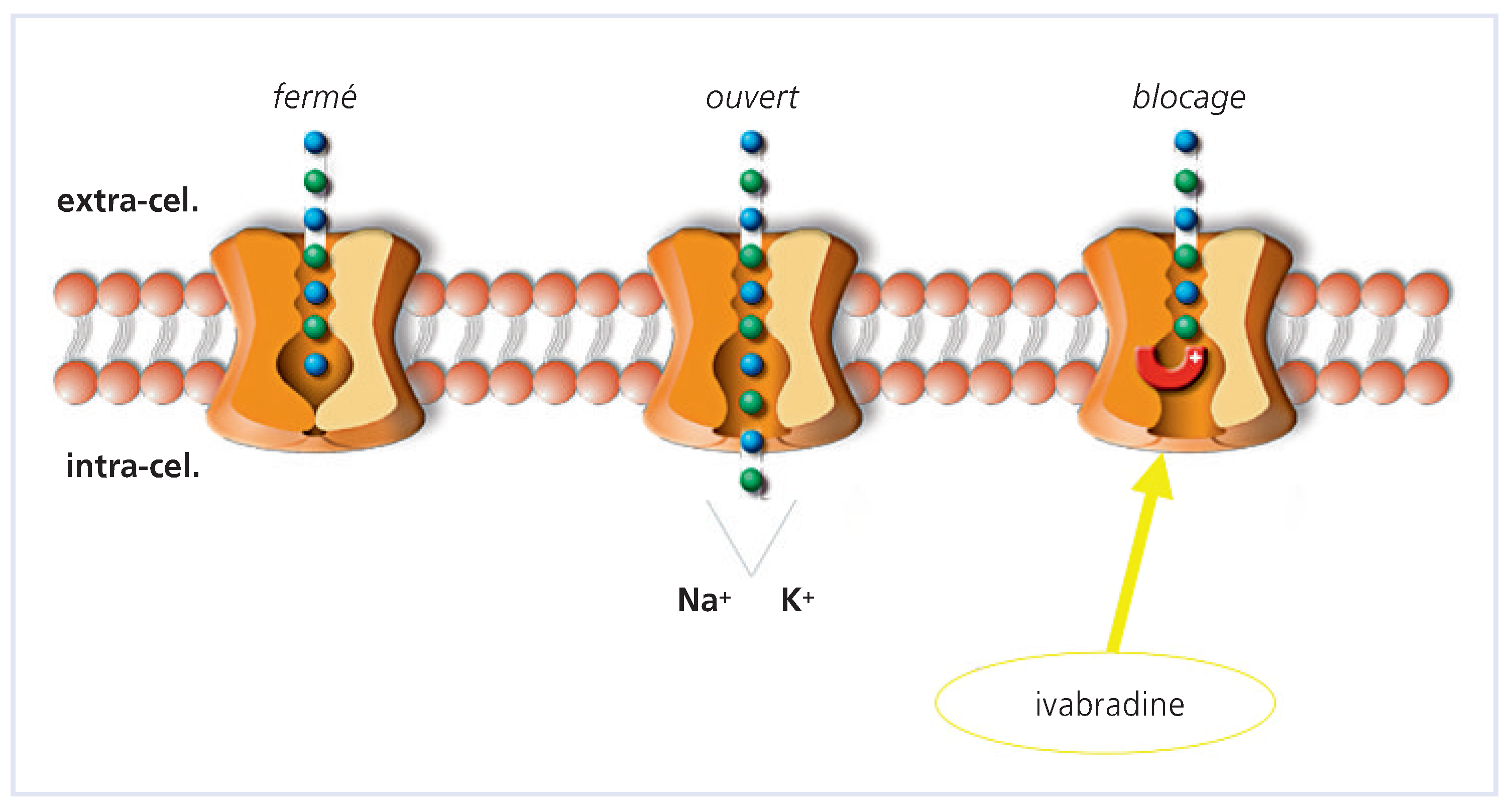fig. 2), ce qui aboutit à un ralentissement de la FC. Cette action est très spécifique et a pour seul résultat une réduction de la FC sans les conséquences inotropes négatives d’autres médicaments bradycardisants tels que les bêtabloquants, et sans influence sur la tension artérielle [