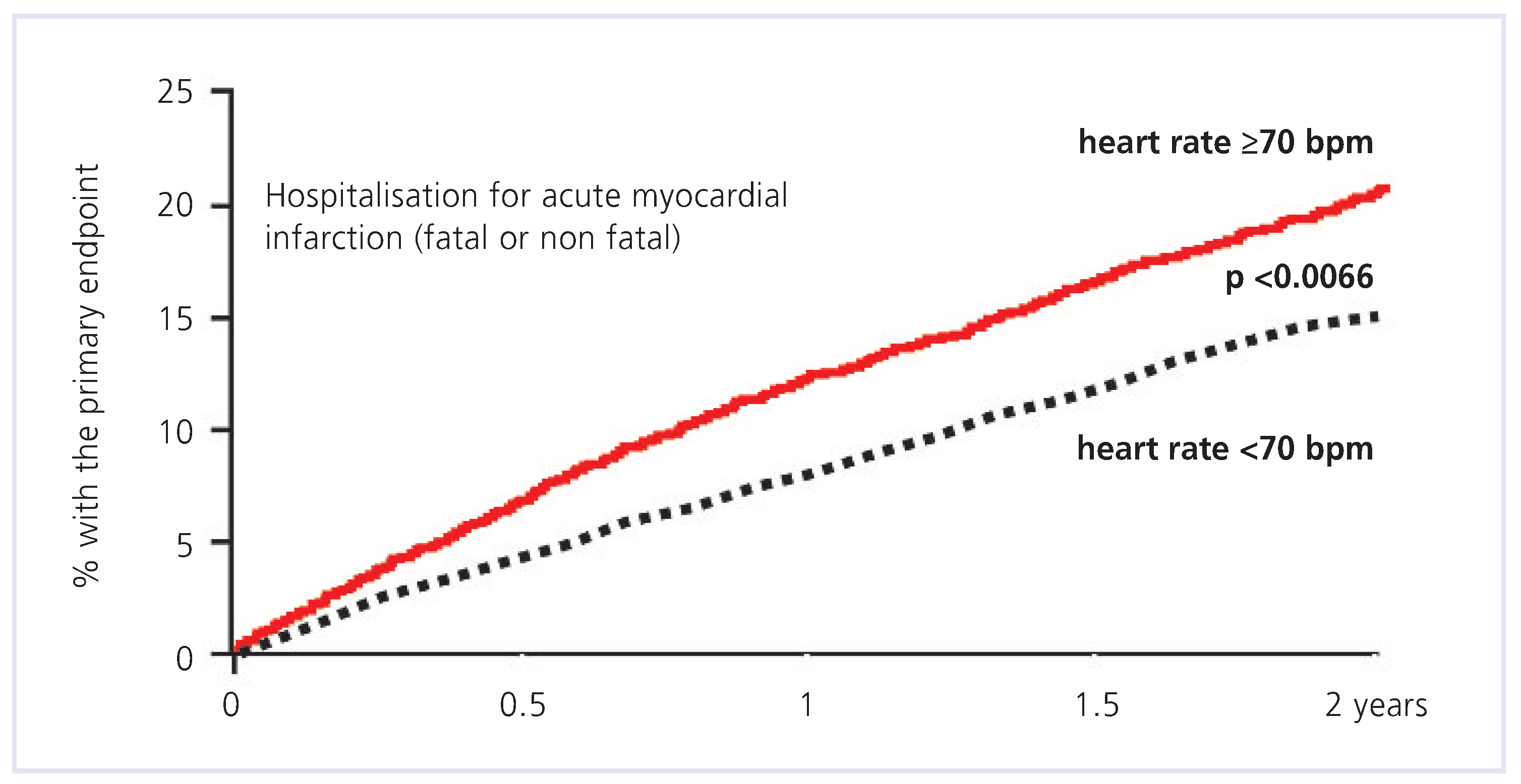 Par ailleurs, cette étude a également confirmé le rôle pronostique de la fréquence cardiaque en comparant, chez les patients recevant un placebo, ceux ayant une fréquence cardiaque ≥70 bpm, à ceux ayant une fréquence inférieure à 70 bpm (