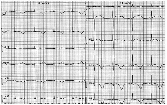 ECG one month after organophosphate ingestion demonstrating almost complete normalisation of the QTc interval (447 ms) but persistent negative T waves in leads I, II, aVL and V4–V6.