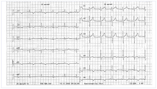 A 50-year-old man was admitted to our hospital 2.5 hours after suicidal ingestion of 100 ml of quinalphos (Ekalux), an environmental organophosphorus insecticide pollutant. Immediately, a therapy with atropine (a total of 15 mg within the first 28 hours) and the organophosphate antidote obidoxime (Toxogonin; a total of 1000 mg within the first 24 hours) was initiated. The first electrocardiogram (ECG) recorded 30 minutes after admission demonstrated sinus tachycardia and moderate prolongation of the QT interval (QTc 503 ms) but was otherwise inconspicuous (Figure 1). During the further course, the ECG demonstrated progressive repolarisation abnormalities, including the development of negative T waves and pronounced prolongation of the QTc interval peaking at day eleven after organophosphate ingestion (QTc 648 ms) (Figure 2). Cardiac troponin T levels remained within the normal range during the entire hospital course. An echocardiography performed eleven days after admission demonstrated normal cardiac dimensions, heart valves and normal biventricular systolic function. There was no evidence of an elevated pulmonary artery pressure. The hospital course was characterised by the development of an acute respiratory distress syndrome (ARDS). However, except for the ECG alterations no cardiac complications, particularly not any arrhythmias occurred during the hospitalisation on our intensive care unit. After the QTc interval had declined to 510 ms 15 days after suicidal organophosphate ingestion, the patient was transferred from our intensive care unit to a mental institution for further therapy. Despite rapid physical recovery and normalisation of the QTc interval within four weeks after hospital admission (Figure 3), complete normalisation of repolarisation abnormalities required three months.
