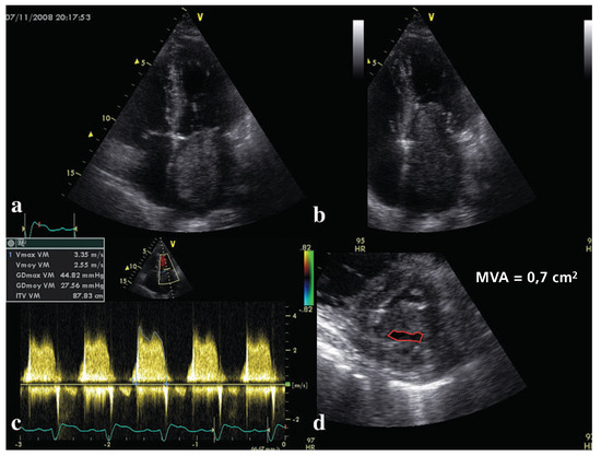 Echocardiographie transthoracique: vues apicales en 4 cavités en systole (A) et en diastole (B) montrant une volumineuse masse auriculaire gauche prolabant dans l’orifice mitral en diastole et réalisant une sténose critique sur le plan hémodynamique (C) et anatomique (D). MVA = surface valvulaire mitrale planimétrée en court axe de la valve.