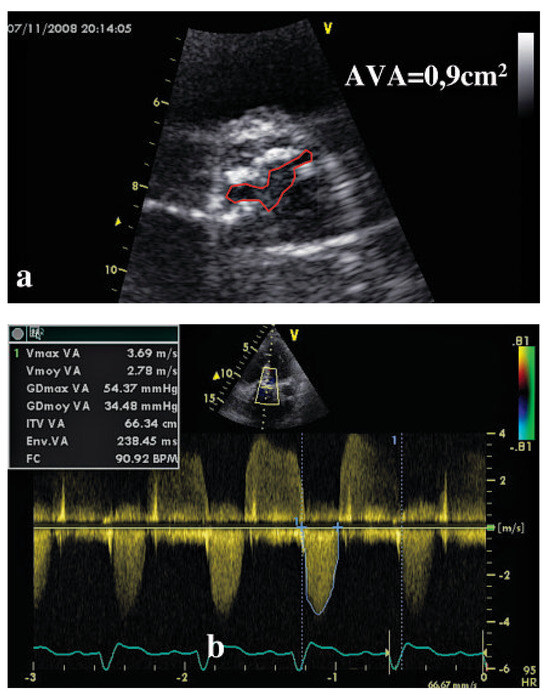 Echocardiographie transthoracique: planimétrie en court axe de la valve aortique (A) et gradient sur la valve par interrogation Doppler sur une vue apicale 5 cavités (B); AVA = surface valvulaire aortique par planimétrie directe.