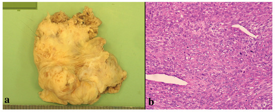 Aspect macroscopique d’un fragment important de la tumeur (a) et histologie (b) montrant un entrelac de cellules fusiformes à gros noyaux. Le profil immuno-histochimique est suggestif d’un sarcome intimal.