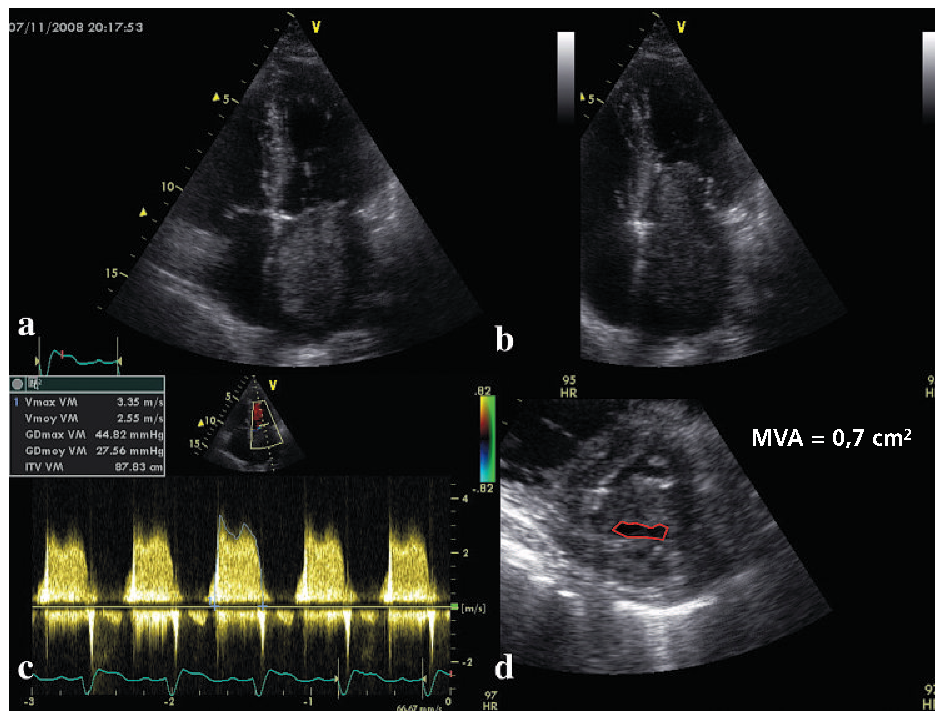 Figure 1. Echocardiographie transthoracique: vues apicales en 4 cavités en systole (A) et en diastole (B) montrant une volumineuse masse auriculaire gauche prolabant dans l’orifice mitral en diastole et réalisant une sténose critique sur le plan hémodynamique (C) et anatomique (D). MVA = surface valvulaire mitrale planimétrée en court axe de la valve.