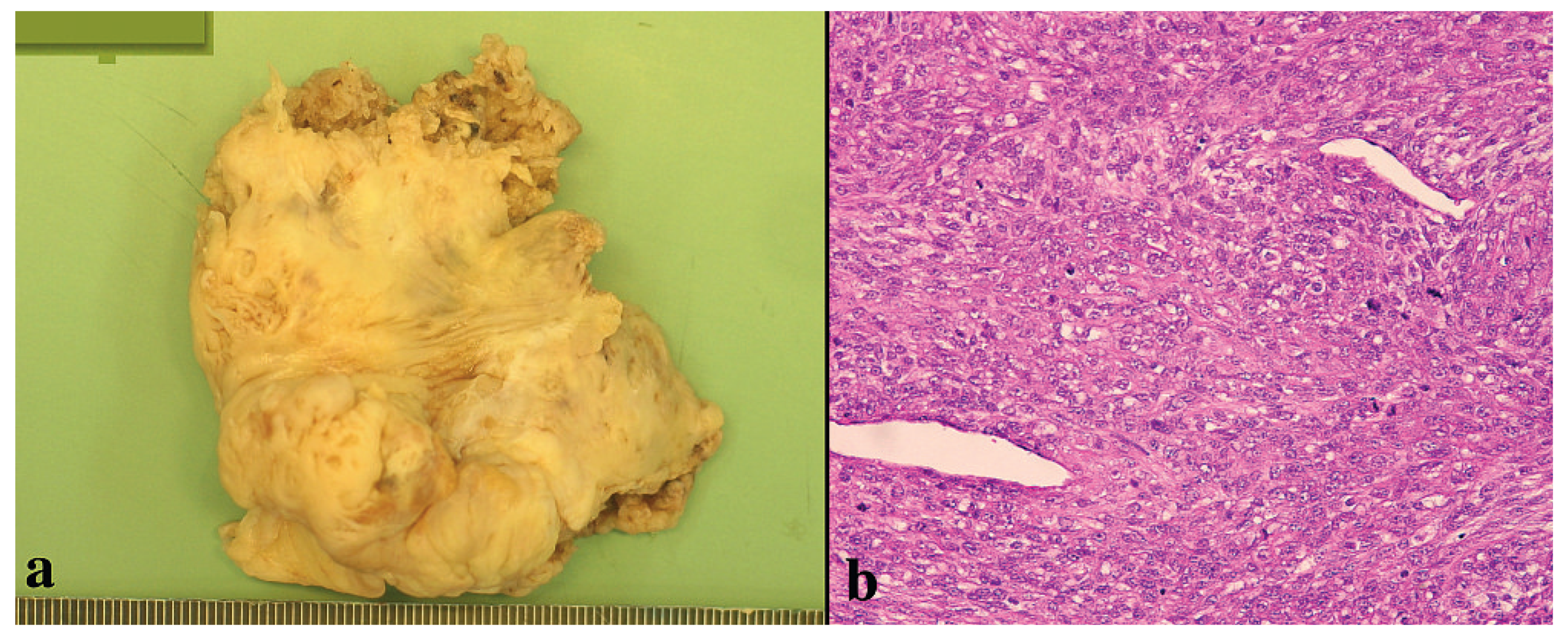 Figure 3. Aspect macroscopique d’un fragment important de la tumeur (a) et histologie (b) montrant un entrelac de cellules fusiformes à gros noyaux. Le profil immuno-histochimique est suggestif d’un sarcome intimal.
