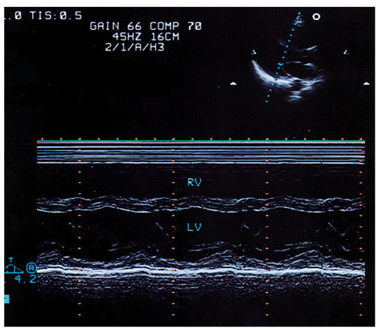 Parasternal long axis view with M-mode echocardiogram showing depressed contraction in the septal and posterior wall as a sign of global left ventricular systolic dysfunction.RV = right ventricle; LV = left ventricle; IVS = interventricular septum; PW = posterior wall.
