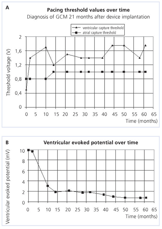 A 48-year-old woman experienced an episode of cardiac decompensation due to a third-degree atrioventricular block. Normal systolic and diastolic functions of both ventricles were documented. A dual-chamber pacemaker was implanted and eliminated the patient’s symptoms. Two years later, the patient was hospitalised due to biventricular heart failure and wide QRS diomyopathy which was documented by echocardiogtachycardias. Pacemaker follow-up revealed a continu- raphy (Figure 1, Figure 2 and Figure 3). Granulomatous giant cell myocarditis ous deterioration of the pacing threshold and of the (GCM) was diagnosed following endomyocardial biopsy evoked action potential combined with a congestive car- (Figure 4 and Figure 5). Since the patient declined evaluation for heart transplantation, immunosuppressive treatment with cyclosporine, azathioprine and prednisolone was established. This resulted in subjective improvement and regression of inflammation and granulomas, but was accompanied by progressive renal failure. Echocardiography showed a remarkable recovery of left and right ventricular function (Figure 6). Thepatient’s condition has remained stable for the past 4 years.