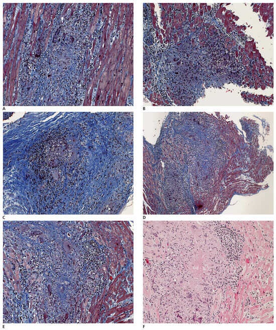 A–F Different biopsy fragments showing extensive destruction of the myocardium by poorly granuloma-like granulation tissue composed of irregularly distributed giant cells, inflammatory cells and fibrous tissue. F A central areactive necrosis is present.