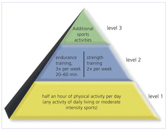 The “pyramid of movement” as proposed by the BASPO (Swiss governmental agency of sports). (With kind permission to reprint from BASPO, http://www.sport.admin.ch/hepa/downloads/ Bewegung_pyramide_de.pdf, copyright © 2009.).