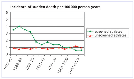 Incidence of sudden cardiac death during sports in screened athletes and unscreened population. Screening was introduced in the early 1980s (adapted from [20]).