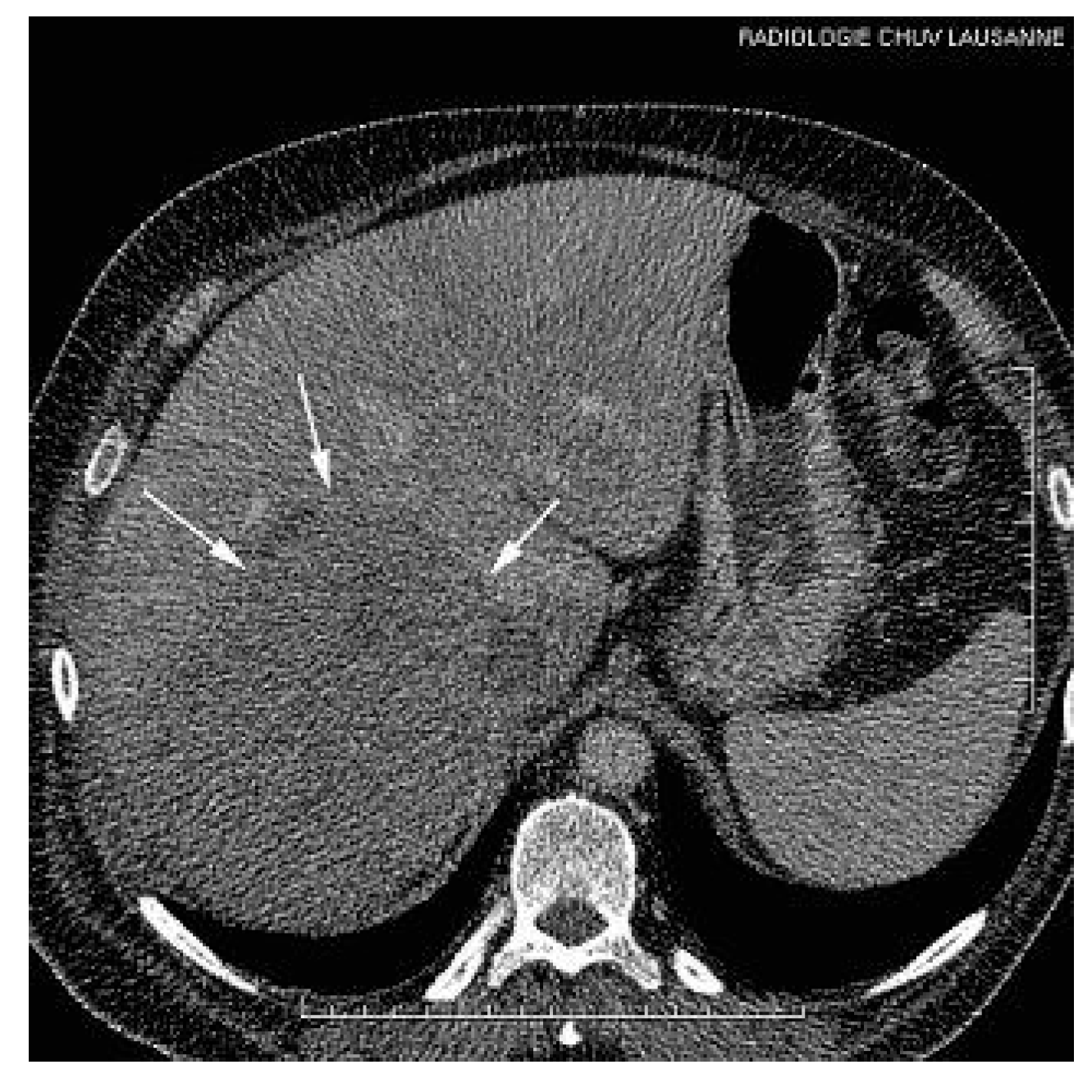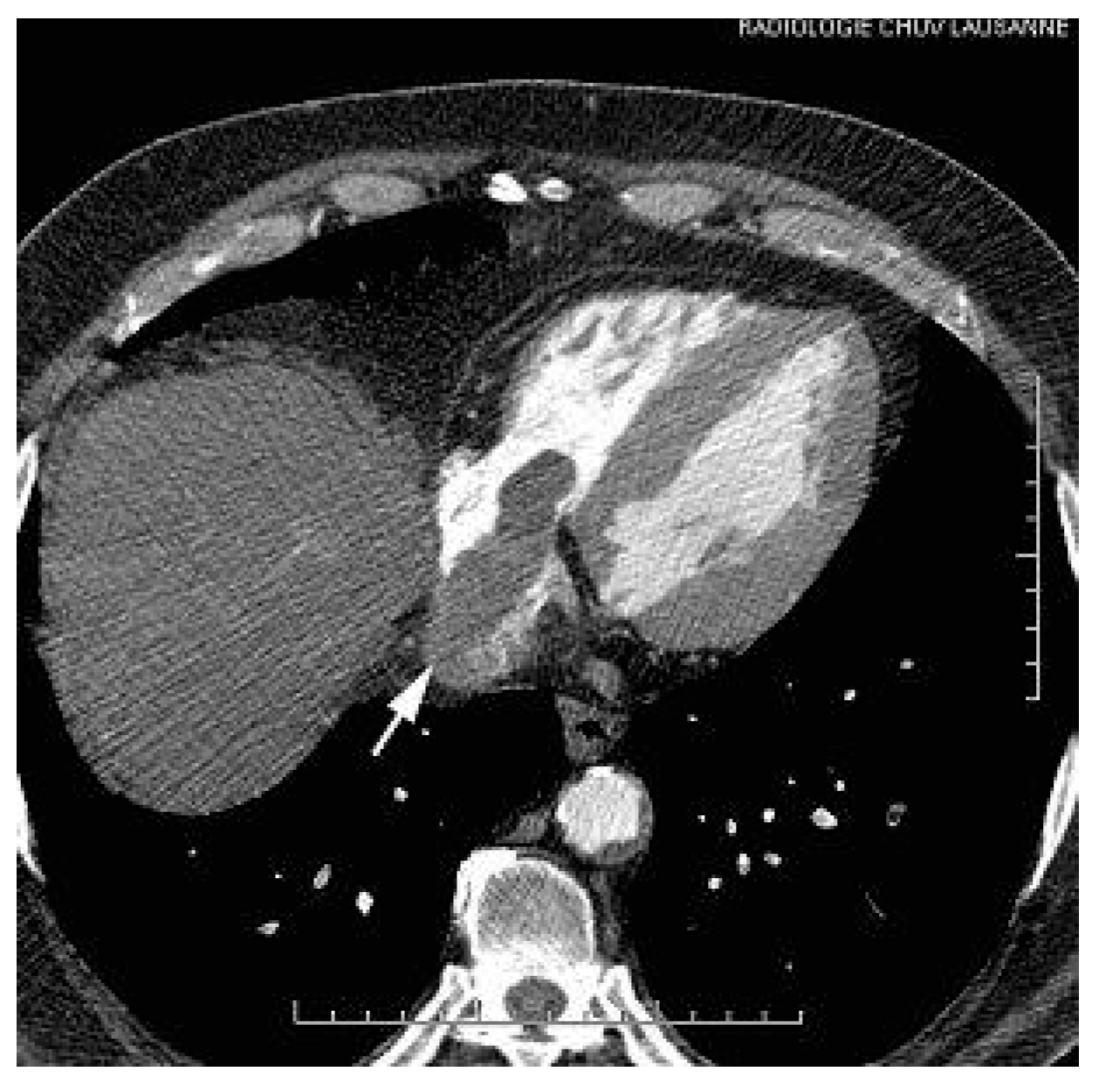 Zaugg, D.; Qanadli, S.D.; Jaussi, A. Asymptomatic Right Atrium Extension of a Hepatocellular Carcinoma Detected by Echocardiography. Cardiovasc. Med. 2010, 13, 25. https://doi.org/10.4414/cvm.2010.01467