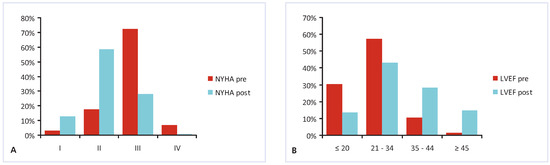 Results: 208 patients (mean age 63.8 ± 10.9 years, 79.3% male) were included in the study. Ischemic etiology of heart failure was present in 49%; 79% of patients were in NYHA functional class III/IV. Mean QRS-duration was 153 ms (±30 ms) and mean ejection fraction 26 ± 8%. Median duration of hospital stay was two days. Perioperative complications were rare and comparable to those of large clinical trials. CRT lead to a considerable clinical and echocardiographic improvement. While NYHA functional class improved from 2.8 ± 0.6 to 2.1 ± 0.7 (