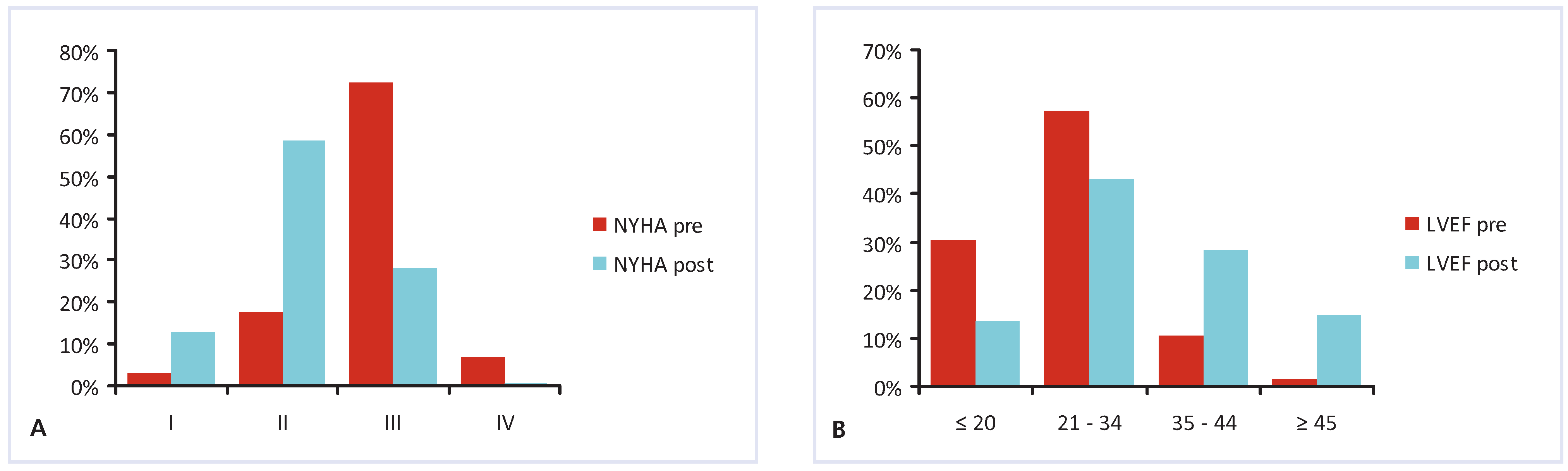 Verbesserung der Dyspnoebeschwerden (nach NYHA, A) und der linksventrikulären Ejektionsfraktion (LVEF, B) nach CRT-Implantation.