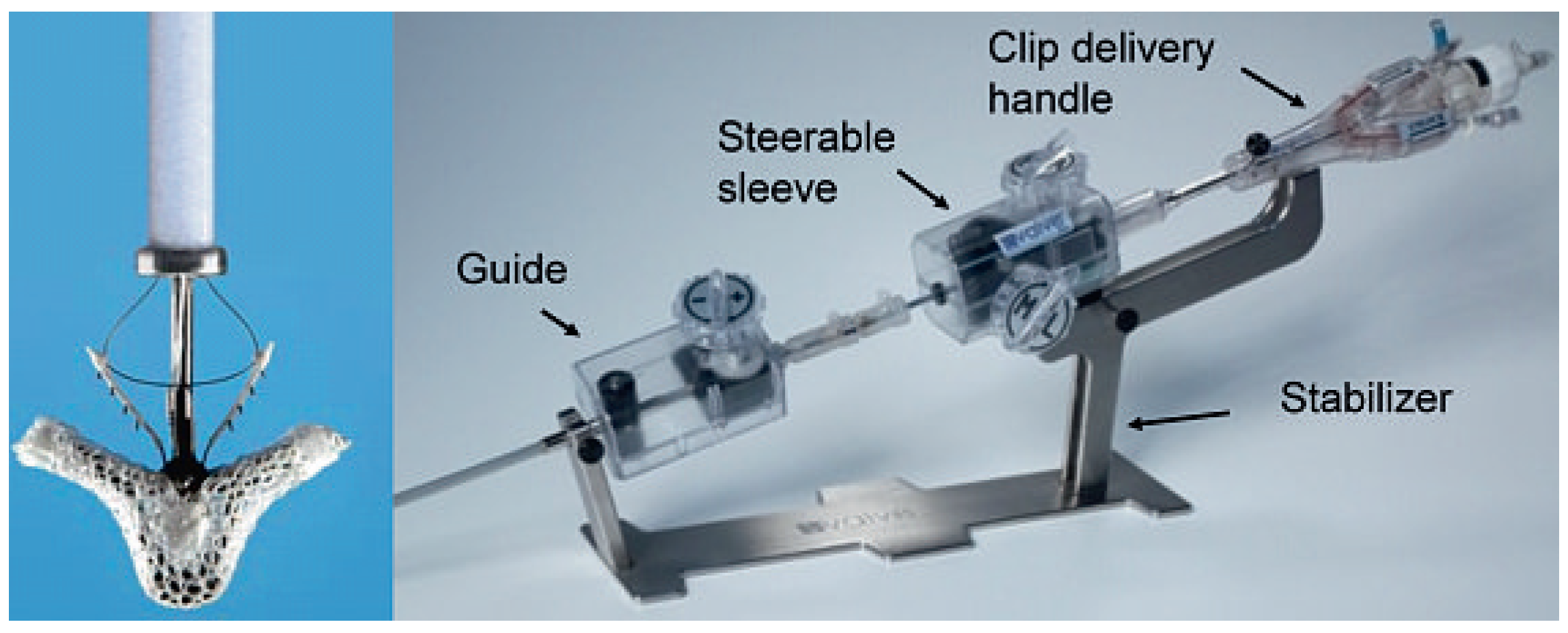 The patient, with a history of aortic valve replacement 4 years prior and known mitral regurgitation for the last 2 years, was referred to us due to worsening symp-toms of heart failure over the 3 months prior. She presented with dyspnoea NYHA class III, despite medical treatment with an ACE-inhibitor, a thiazide and a loop diuretic. The patients’ history was also characterised by an ischemic stroke with partial right leg hemiparesis, osteoarthritis and renal function impairment (creatinin clearance 36 ml/min).
