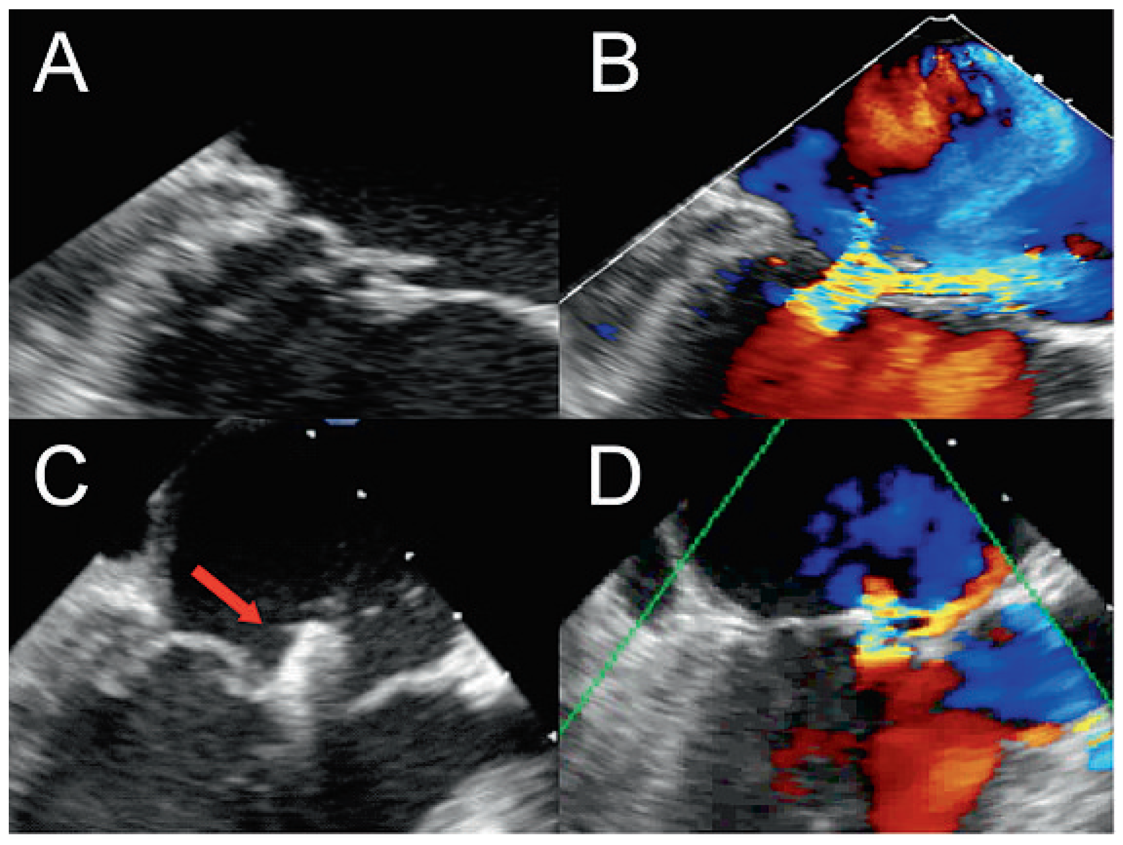 Figure 4. Two-dimensional echocardiogram showing the flail posterior leaflet (A) with severe mitral regurgitation on colour Doppler (B). MitraClip® (red arrow) with mild residual regurgitation after placement (C) and as seen with colour Doppler (D).