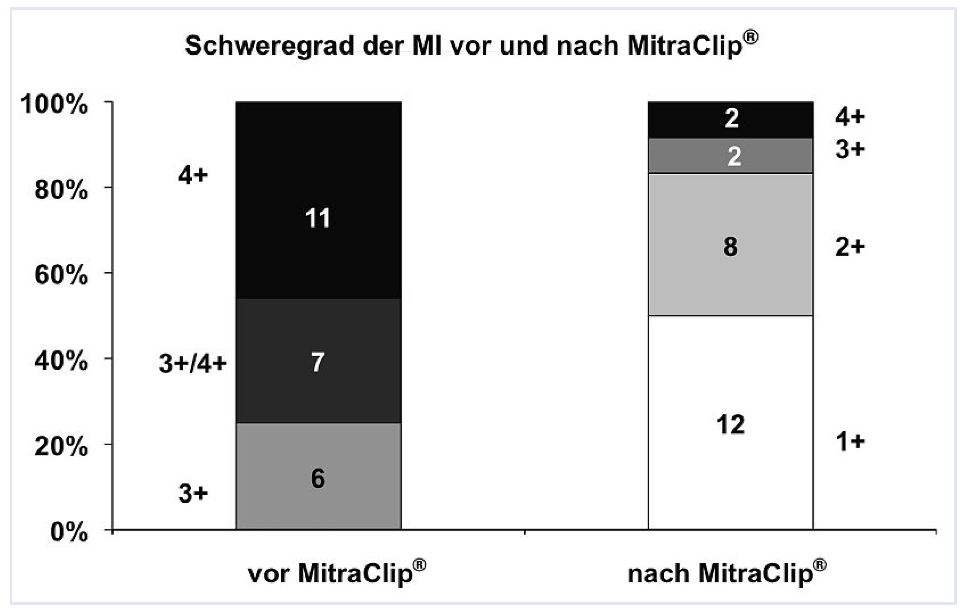 Bei sämtlichen, erfolgreich implantierten Patienten (n = 22) kam es zu einer Verbesserung der Mitralinsuffizienz, bei 15 (68%) um mehr als zwei Schweregrade, bei 7 Patienten (32%) um mehr als einen Schweregrad. Bei 20 der 22 erfolgreich implantierten Patienten (91%) lag der Schweregrad der MI nach Intervention zwischen 1+ und 2+.