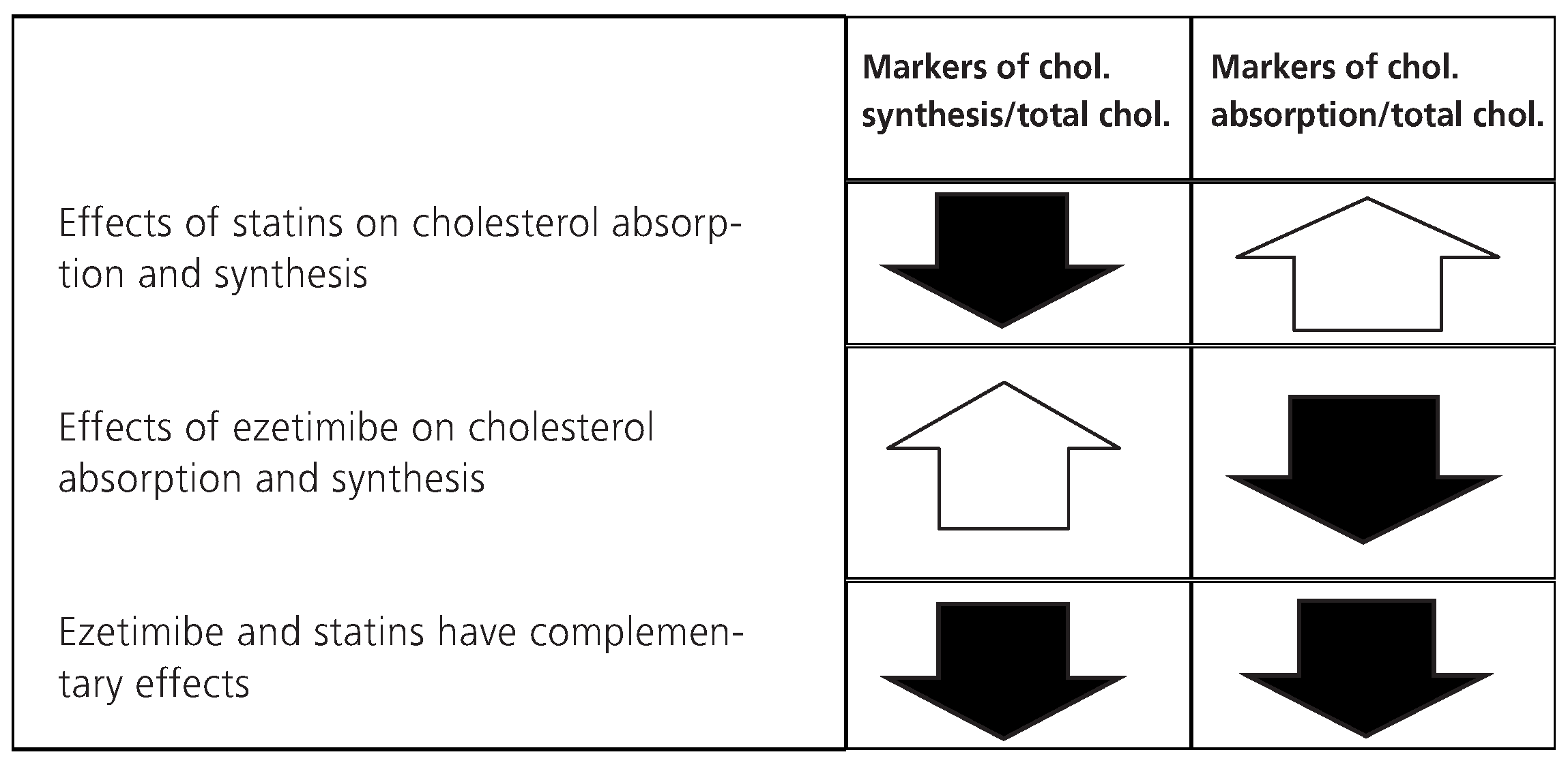 First, statins inhibit cholesterol synthesis by inhibition of HMG CoA reductase, a rate determining enzyme in the endogenous cholesterol synthesis. This is partially compensated by an increased absorption rate of cholesterol in the intestine. Vice versa, ezetimibe inhibits cholesterol absorption of exogenous and biliary cholesterol in the intestine, leading to an increased synthesis of cholesterol in the liver. The combination of both drugs has a complementary effect on both mechanisms (