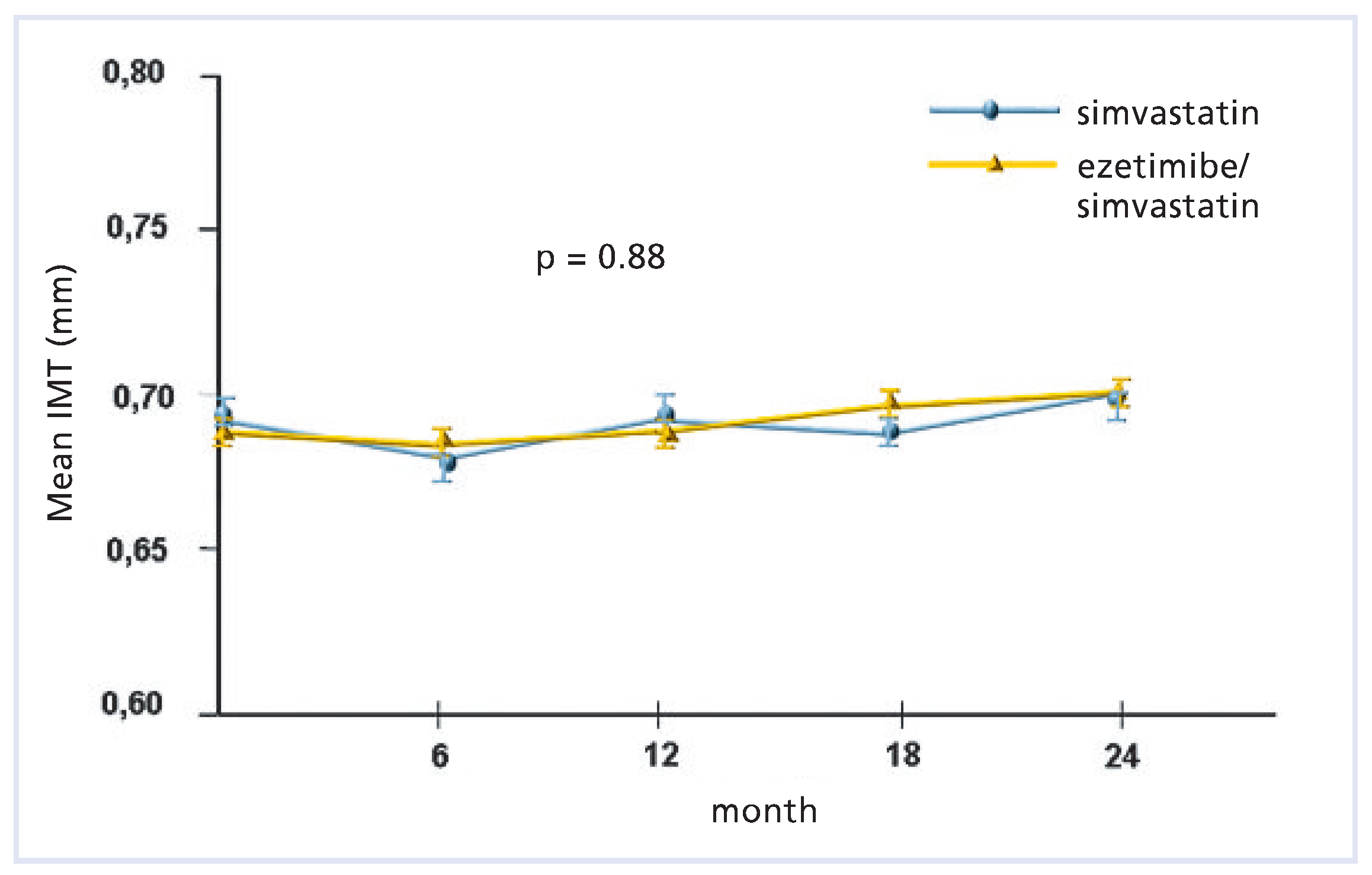 This was a double-blind, randomised, 24-month trial comparing the effects of daily therapy with 80 mg of simvastatin plus placebo versus 80 mg of simvastatin plus 10 mg ezetimibe in 720 patients with heterozygous familial hypercholesterolemia.