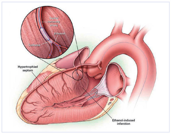 Hypertrophic obstructive cardiomyopathy can cause symptoms such as dyspnoea, angina pectoris and syncope. First-line pharmacological therapy includes betablockers, verapamil and disopyramid. However, 5–10% of patients with left ventricular outflow tract gradient are unresponsive to medical treatment. Therapeutic options for patients with drug-resistant symptoms include surgical myectomy (SM) and alcohol septal ablation (ASA). The former has been performed for more than 50 years and involves surgical resection of the basal septum. The latter, which was proposed as an alternative to surgical therapy 15 years ago, is a catheter-based technique involving selective injection of ethanol in a septal coronary artery to induce a scar at the level of the basal septum. Both procedures are associated with excellent symptom relief and long-term survival. Complication rates are also comparable, although complete heart block requiring permanent pacemaker implantation tends to occur more frequently following ASA. Moreover, SM and ASA have never been compared by a randomised controlled trial. The choice of treatment should therfore be based on local availability and expertise as well as patient’s preference and associated conditions, taking into account the benefits and limitations of both techniques. Full article