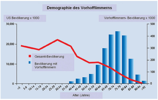 Vorhofflimmern ist die häufigste Rhythmusstörung und ist verantwortlich für einen Drittel aller Spitaleinweisungen [1]. Die Prävalenz für Vorhofflimmern steigt altersabhängig von 1% bei unter 60-Jährigen auf über 8% bei über 80-Jährigen (Figure 1; [2]). In Europa leiden etwa 4,5 Millionen Menschen unter Vorhofflimmern [3]. Diese Zahl wird mit dem Bevölkerungswachstum und der zunehmender Lebenserwartung weiter zunehmen. Aber auch jüngere Patienten können unter Vorhofflimmern leiden. Somatische Mutationen z.B. im Connexin-40-Gen sind als Prädisposition für idiopathisches Vorhofflimmern beschrieben und dürfen für einen kleinen Teil der Fälle verantwortlich sein [4].