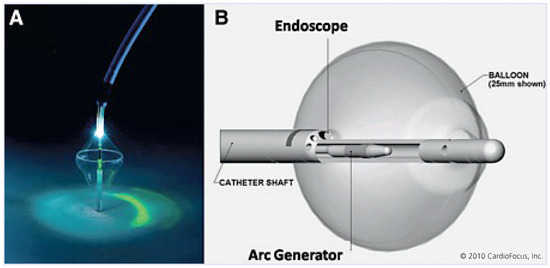 Ballonkatheter (CardioFocus, Inc., Marlborough, MA, USA): Nach Erleuchtung der Gewebeoberfläche über optische Fasern wird mit einer Laserdiode kontinuierlich Laserenergie appliziert, um eine zirkumferentielle Läsion um die Pulmonalveneneinmündungen zu erzeugen. Nachdruck mit freundlicher Genehmigung.