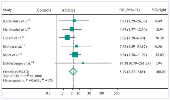 Atrial fibrillation (AF) is the most commonly encountered arrhythmia in clinical practice with an estimated prevalence of 0.4% to 1% in the general population [1], increasing with age to 8% in those older than 80 years [2]. The recognised risk factors for developing AF include age, structural heart disease, hypertension, diabetes mellitus and hyperthyroidism [3]. However, the mechanisms underlying the onset and maintenance of AF in patients younger than 60 years in whom no cardiovascular disease or any other known causal factor is present are yet to be clarified. This condition is termed lone AF [4], and may be responsible for as many as 30% of patients with paroxysmal AF seeking medical attention [5, 6]. It is well known that regular exercise is beneficial to health and reduces the risks of cardiovascular diseases [7, 8]. However, recent studies suggest that longterm endurance exercise may increase the incidence of AF [9–16]. This review article is intended to analyse the possible links between AF and endurance sport practice, the pathophysiological mechanisms responsible for this association and the recommended therapeutic options. Full article