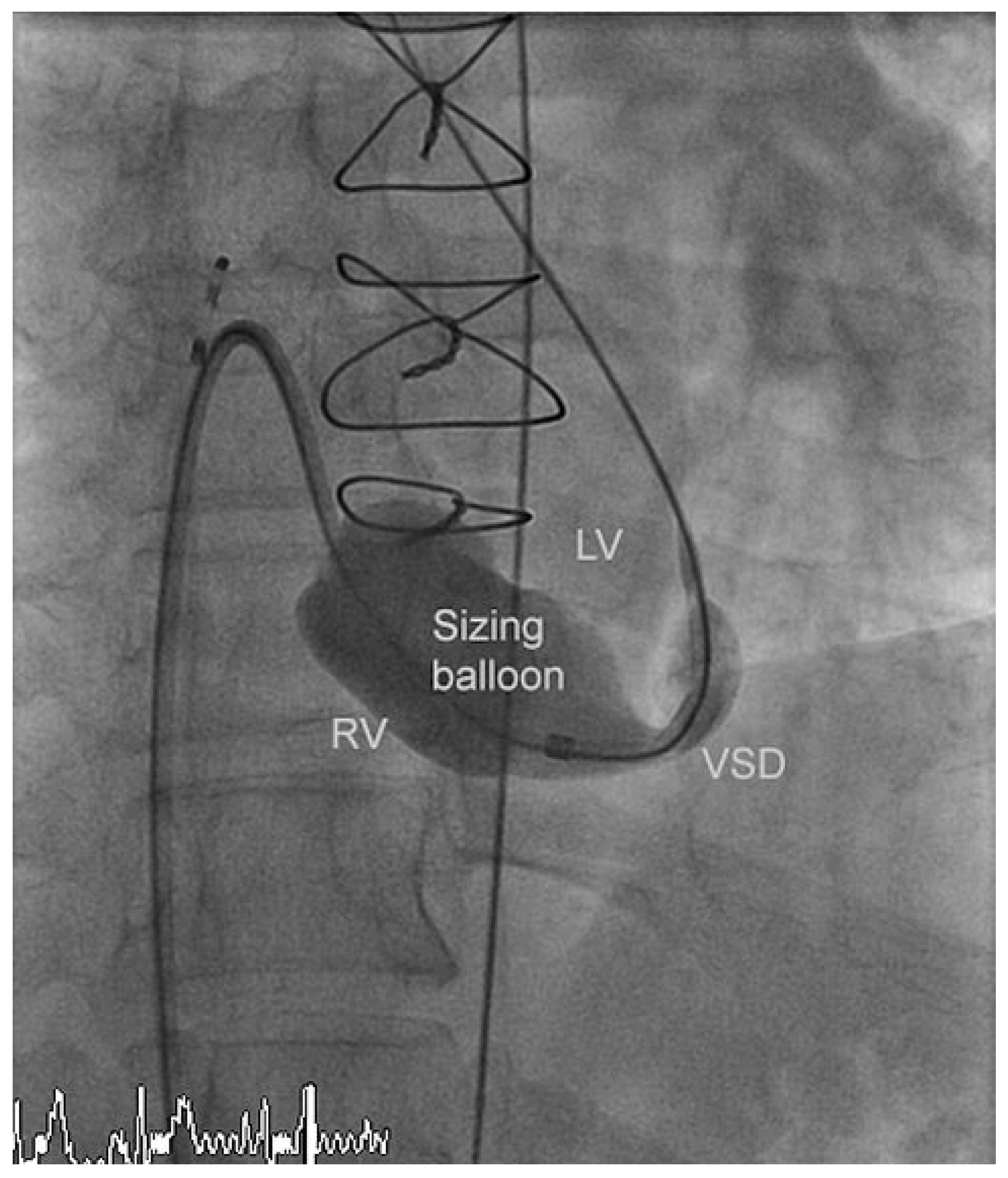The residual VSD was identified with left ventricular contrast injection and the defect was crossed from the left ventricular side using a guide wire which was snared in the pulmonary artery and exteriorized thus creating an arteriovenous loop. The VSD was measured using a 34 mm sizing balloon (St. Jude-AGA) (